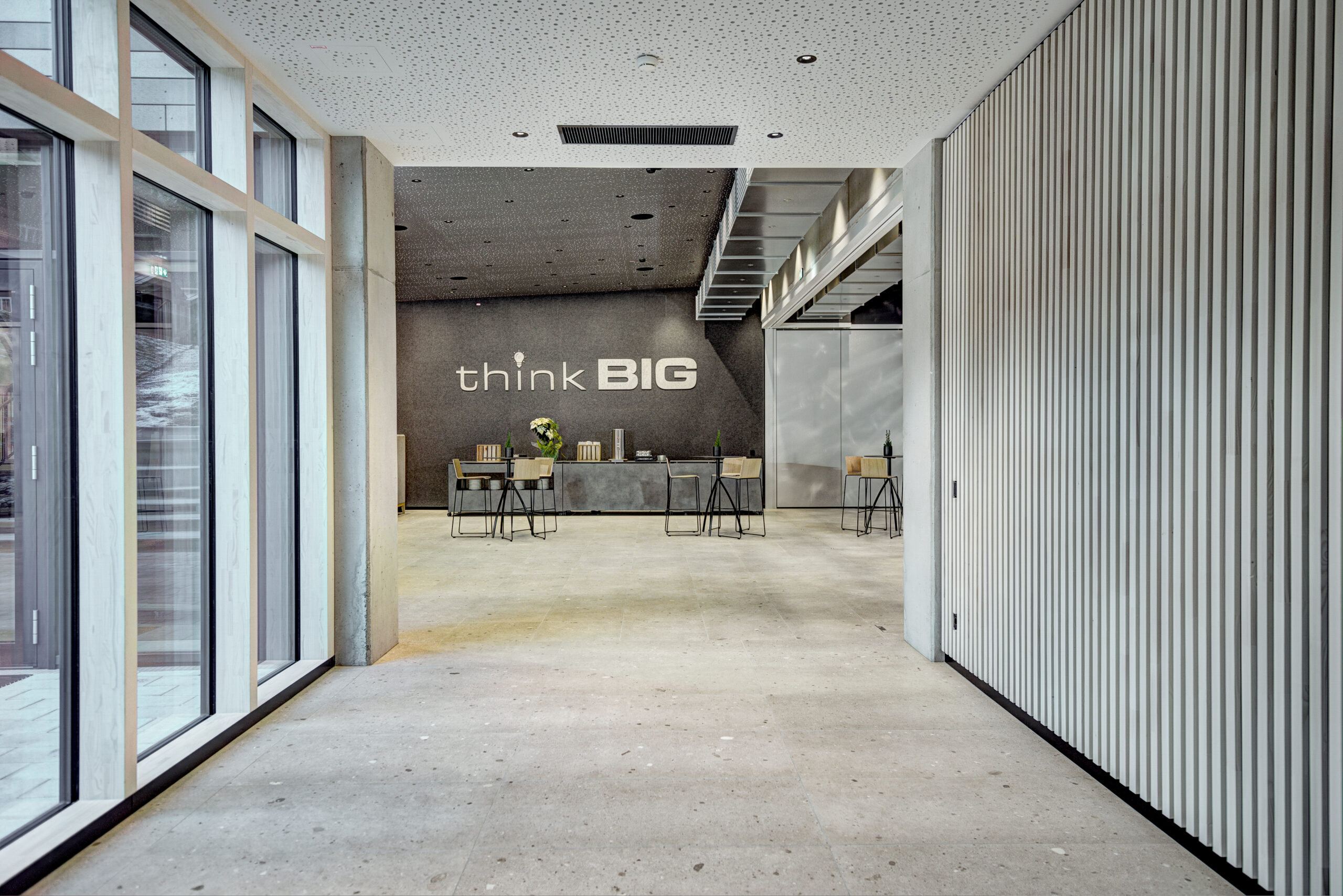 The building opens up to its surroundings with floor-to-ceiling windows. A wide, gently rising staircase lined with green spaces leads upwards – not only functionally, but also as a design element that reinforces the dialog between inside and outside.